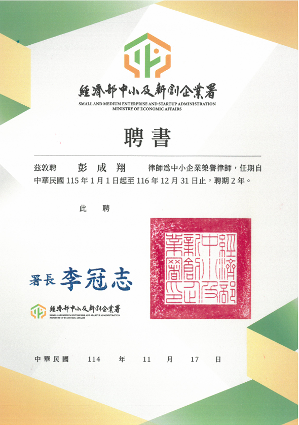為協助中小企業與新創事業因應經營過程中所面臨之各類法律問題,經濟部中小及新創企業署特別設立榮譽律師制度,並透過二年一度的嚴謹遴選程序,遴聘具備實務經驗與專業能力之律師,協助企業降低法遵風險、強化經營基礎。 本所彭成翔律師再度獲經濟部中小及新創企業署續聘,擔任115-116年度經濟部中小企業榮譽律師,未來將持續提供中小企業及新創事業即時的專業法律諮詢服務。 謹此感謝經濟部中小及新創企業署的信任與肯定,未來本所將陸續分享彭成翔律師參與相關服務之資訊,敬請關注。 彭律師個人簡介:點此觀看 中成法律專欄文章:點此觀看 聯絡窗口:02-2563-8900#212 吳小姐/zanewu17@jchlaw.com.tw